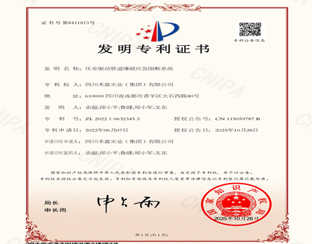 • 四川禾嘉一項具有原始創新非能動智能控制技術的 “壓差驅動管道爆破應急阻斷系統”獲得中國發明專利 [ 2025-11-07 ]